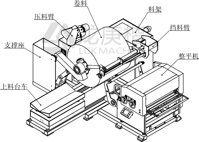 三合一送料機的結構組成:支撐座、壓料臂、料架、擋料臂、整平機、送料機,選配設備:上料臺車