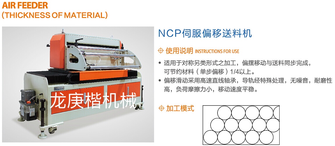龍庚楷偏擺NC送料機工作原理如下:將由材料架開卷、整平整平后的材料料頭,穿過送料機托料架、送料滾筒、出料板后進入沖床模具內,在偏擺NC送料機7寸觸摸屏上設定高送料長度、送料寬度、圓片直徑、偏擺次數后,讓偏擺NC送料機自動運行,NC送料機伺服馬達一邊通過升降控制裝置控制沖壓連續模的沖壓動作,一邊通過物料前進輸送裝置控制物料前進的距離和速度,并通過橫向平移驅動裝置控制物料橫向平移的距離。這樣,當在板材上完成第一次沖壓時,NC送料機伺服馬達可通過橫向平移驅動裝置帶動活動機架橫向平移,進而帶動板材橫向平移適當的距離,使沖壓連續模先沿橫向排布方向對板材進行逐個沖壓。當第一排沖壓完成后,使橫向平移驅動裝置帶動活動機架及物料橫向平移適當距離,物料前進輸送裝置帶動物料前進適當距離后,沖壓連續模接著進行第二排的沖壓工作。根據沖壓孔徑的大小和板材的寬度,通過精確計算每次橫向平移的距離和/或前進的距離,可使在板材上形成的各個沖壓孔之間的間隙最小,最大化的提高了材料的利用率。